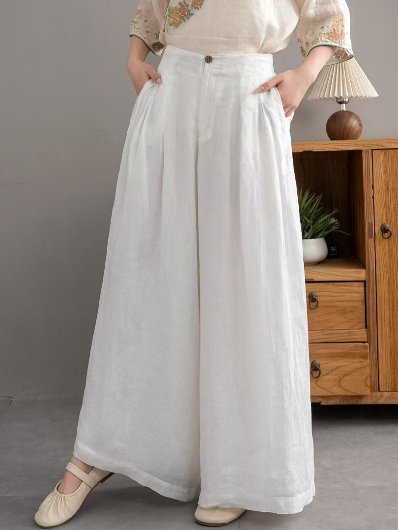 Summer literary solid color wide leg ramie casual pants loose slim straight pants double layer high waist casual pants for women