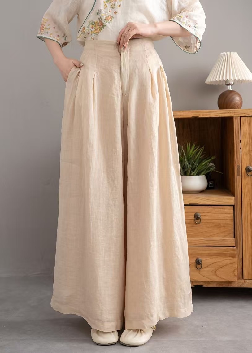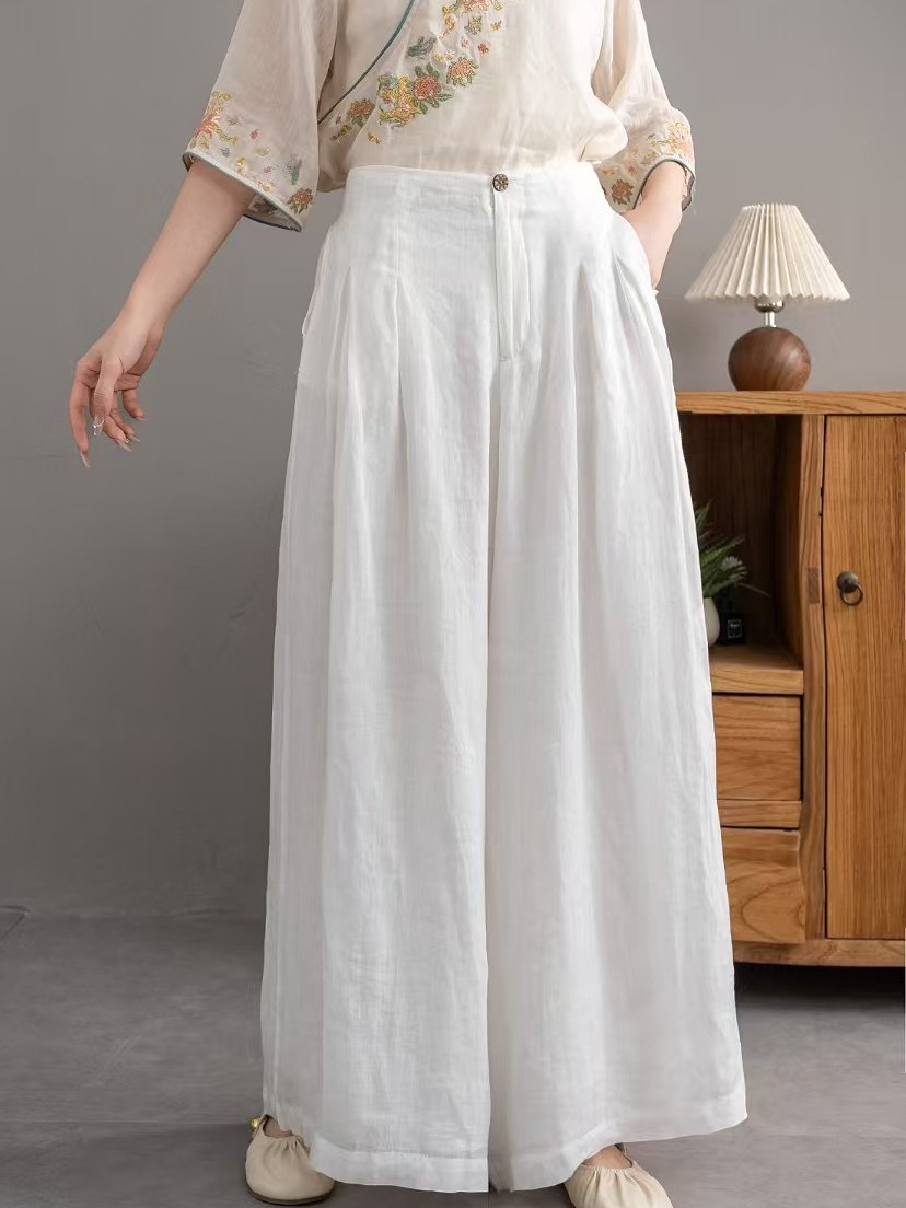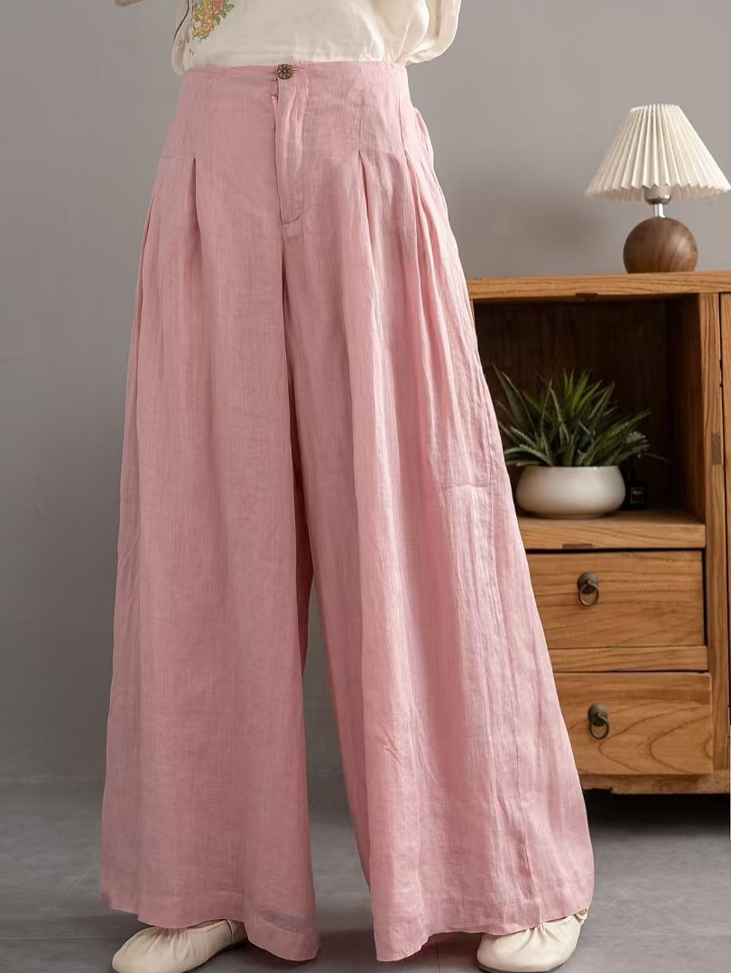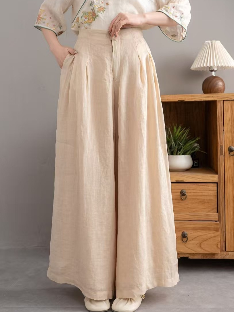 Summer literary solid color wide leg ramie casual pants loose slim straight pants double layer high waist casual pants for women